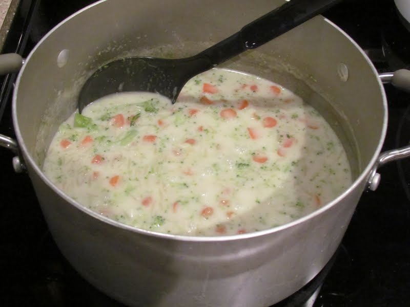 When I make soup for dinner, I try to make it hearty enough to fend for itself. Wimpy soup is no good. That's why I usually try to add a starch, and why my soup often times has a cream based broth. This has both. This is a great "get-rid-of-all-the-veggies-in-your-fridge-and-freezer" soup. I happened to have broccoli and carrots, so that's what made it in the soup. Feel free to adjust. Haha.